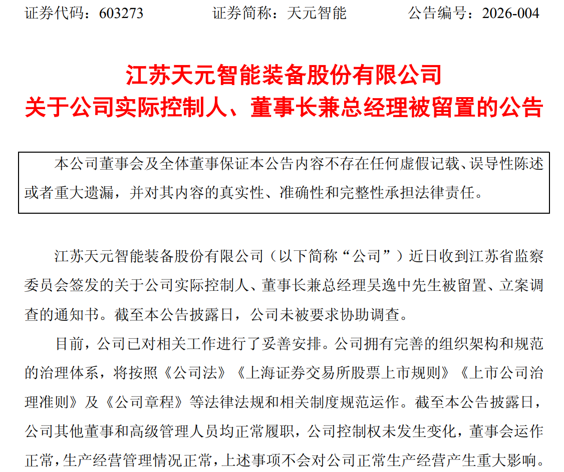 天元智能(603273)1月18日晚间公告,公司近日收到江苏省监察委员会签发的关于公司实控人、董事长兼总经理吴逸中被留置、立案调查的通知书。截至公告披露日,公司未被要求协助调查。