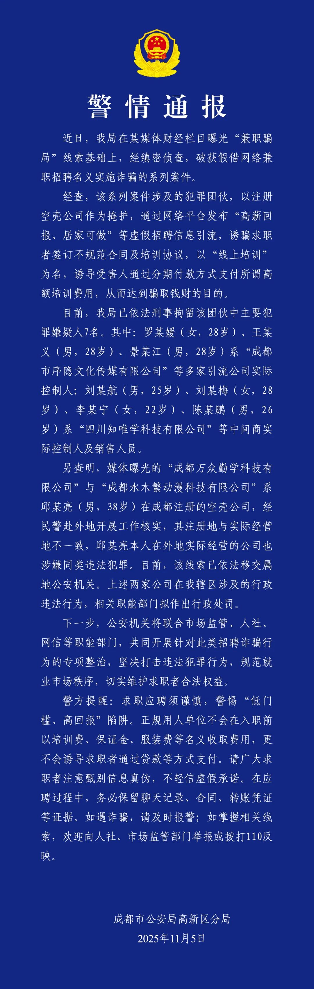 配资排行APP下载 成都警方通报:破获系列网络兼职招聘诈骗案,7人被刑拘