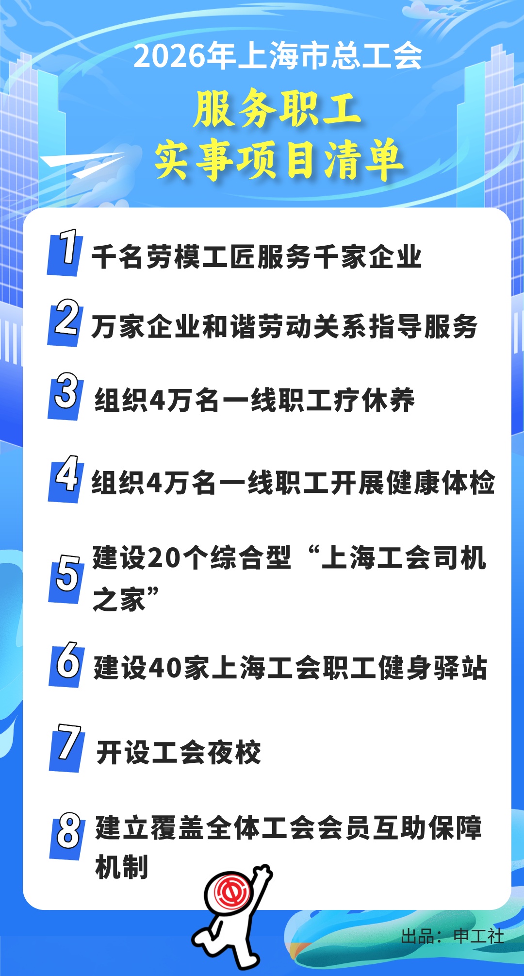 上海市总工会近日公布2026年8件服务职工实事项目,涵盖维权服务、技能服务、文体服务、帮困服务、健康服务、生活服务等6个大类。