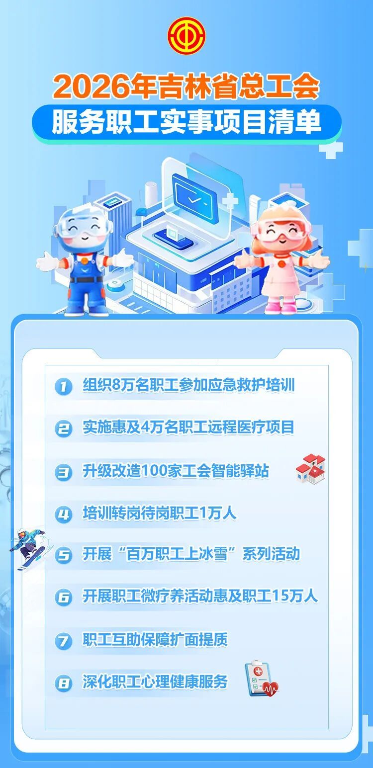 吉林省总工会为全省职工备好了一份沉甸甸的“新年礼物”!聚焦职工急难愁盼问题,从技能成长、医疗健康、服务阵地、疗休养、文体普惠五大维度,重磅推出服务职工8件实事项目清单。