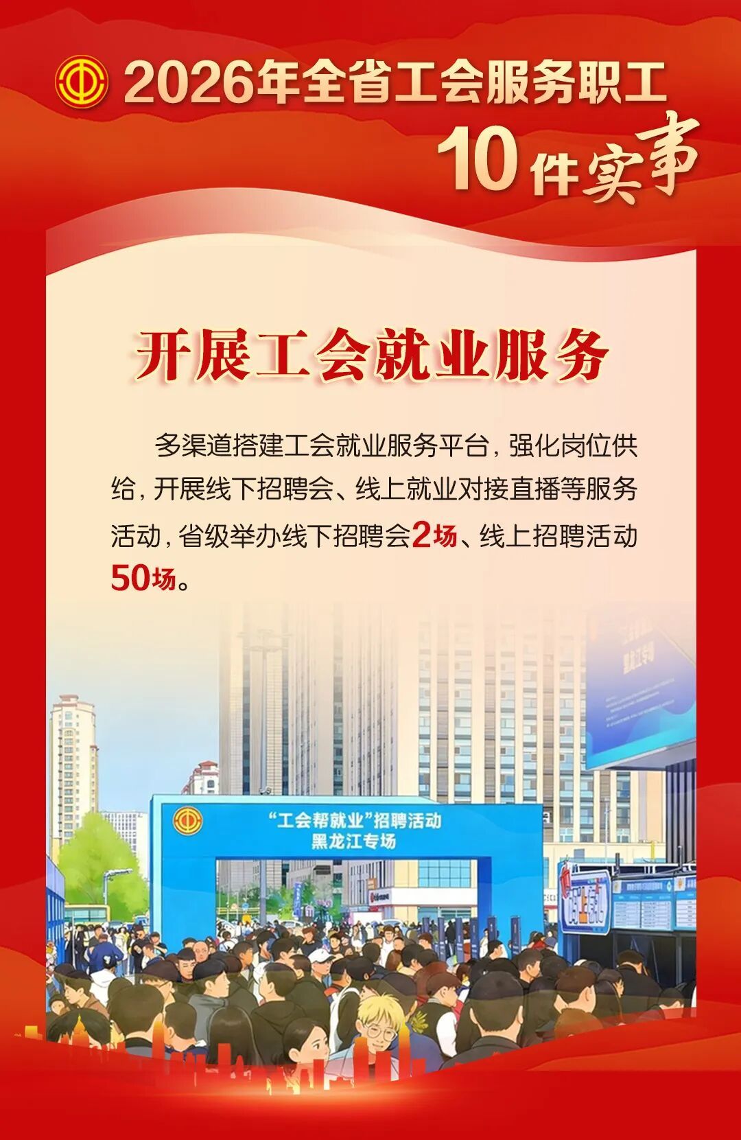 春送岗位:举办25场春送岗位“工会帮你来就业”专场招聘会,全年日常举办28场线下就业招聘会、11场线上招聘会,组织100家企业线上直播带岗。