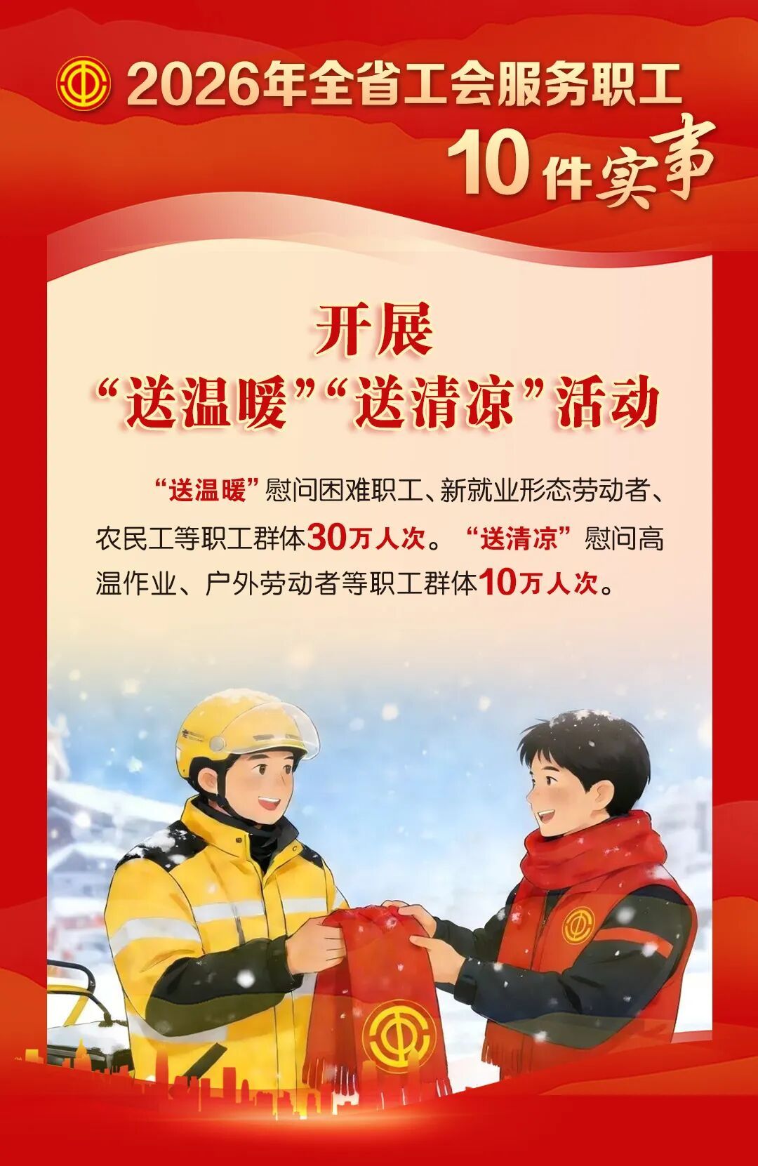 冬送温暖:开展元旦、春节“两节”送温暖活动,走访慰问一线职工15000人次以上,其中新业态职工500人次以上。