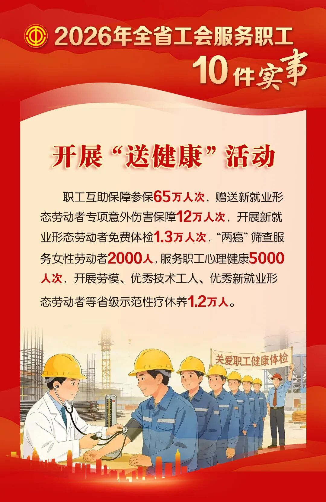 为约4万名农民工、困难职工和新就业形态劳动者开展免费健康体检。