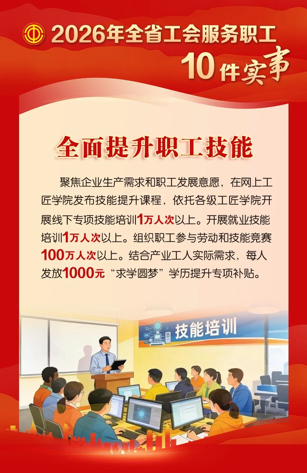“龙城职工大讲堂”送培训进企业活动200场、职工幸福课堂200场。
