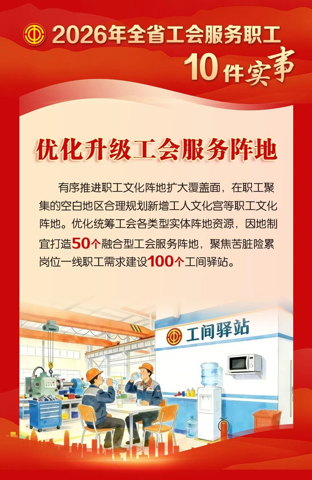 新提升改造15家工会驿站,其中最美驿站培育点不少于3家。