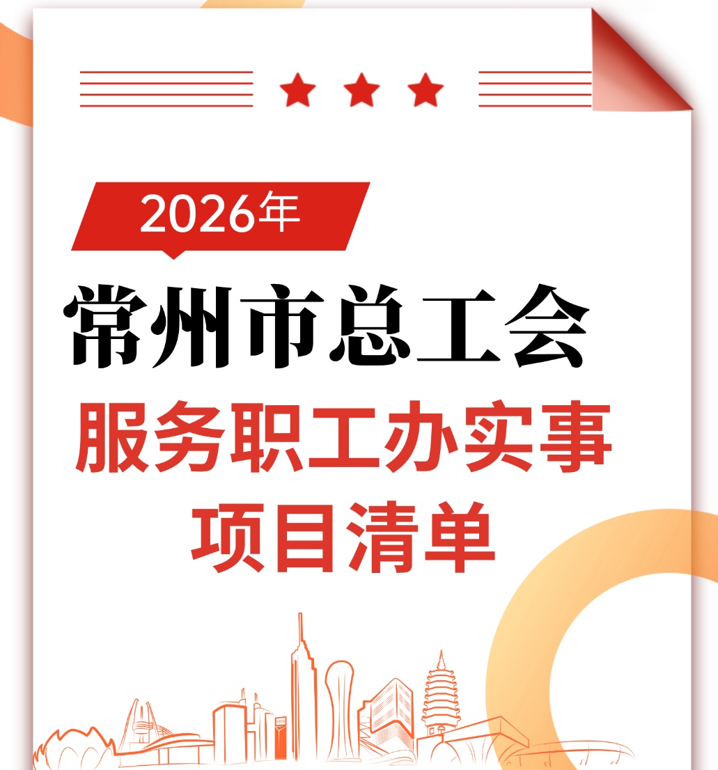 常州市总工会坚持以职工为中心的工作导向,聚焦职工群众“急难愁盼”,以“职工需求”为出发点、以“职工所盼”为攻坚点、以“职工满意”为落脚点,用心用情做好服务职工办实事各项工作。2026年将全力做好八大类31项服务职工办实事项目,真正让“实事清单”成为职工的“幸福清单”,一起来看!